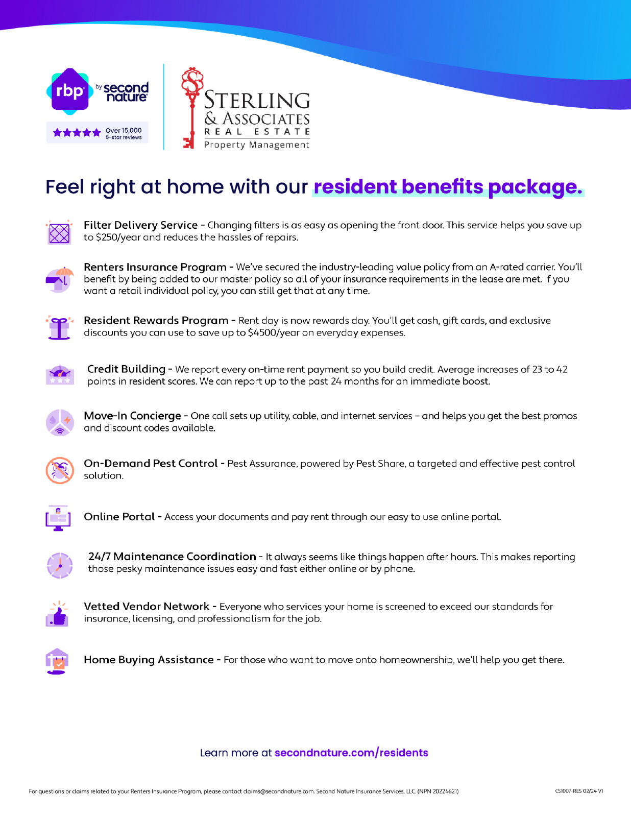 All Sterling & Associates Real Estate residents are enrolled in the Resident Benefits Package (RBP) which includes liability insurance, credit building to help boost the resident’s credit score with timely rent payments, HVAC air filter delivery (for applicable properties), move-in concierge service making utility connection and home service setup a breeze during your move-in, our best-in-class resident rewards program, on-demand pest control, and much more! More details upon application.